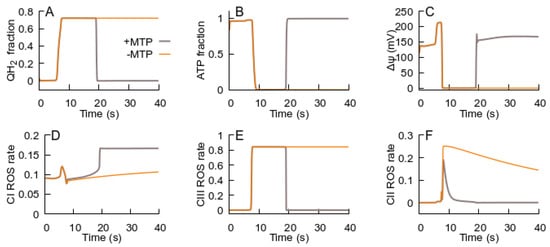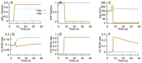 The effect of the MPT on the dynamics of model state variables induced by the same change in external glutamate concentration as in Figure 4. The panels, parameters, and initial values of variables are the same as those used for Figure 4. The panels display the evolution of the state variables: (A) QH2; (B) ATP levels; (C) Δψ; (D–F) relative fractions of ROS-generating species—FMN semiquinone radicals in complex I, semiubiquinone in complex III, and FAD semiquinone in complex II. The orange curve (−MPT) is the same as in Figure 4. The dark curve (+MPT) is computed by taking into account the fact that reducing the ubiquinone pool causes a transition to an ROS-producing state, which causes the MPT.