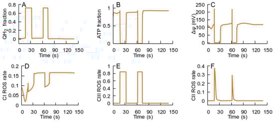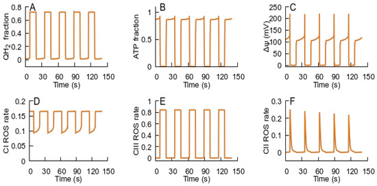 Sustained oscillations of respiration predicted by the model that implements the interplay between the MPT and the RC. The panels display the evolution of the state variables: (A) QH2; (B) ATP levels; (C) Δψ; (D–F) relative fractions of ROS-generating species—FMN semiquinone radicals in complex I, semiubiquinone in complex III, and FAD semiquinone in complex II. ATPase activity is an order of magnitude less.