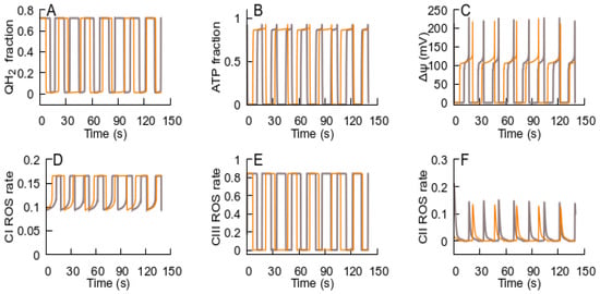 The effect of turnover in the Krebs cycle on the oscillation frequency. The panels display the evolution of the state variables: (A) QH2; (B) ATP levels; (C) Δψ; (D–F) relative fractions of ROS-generating species—FMN semiquinone radicals in complex I, semiubiquinone in complex III, and FAD semiquinone in complex II. The parameters for the orange curves are the same as those used for the simulations shown in Figure 6. For the black curves, the maximal rate for the aspartate transaminase reaction is five-fold higher.