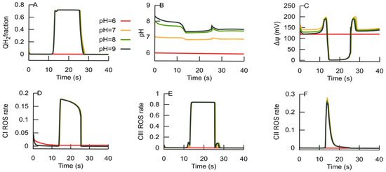 Simulation of pH effects on the dynamics of some state variables. The panels show the dynamics of ubiquinol (A), the matrix pH (B), Δψ (C), ROS generation rates in complex I (D), complex III (E), and complex II (F), expressed as the ratio of potential ROS-generating species to the total amount of the complexes. Simulations were performed for pH 6, 7, 8, and 9, as indicated by the labels in panel (A).
