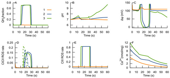 Simulation of Ca2+ uptake. Dynamics of ubiquinol (A), the matrix pH (B), Δψ (C), ROS generation rates in complexes I (solid lines) and II (dashed lines) (D), and in complex III (E), and potential ROS-generating species, expressed as a ratio to the total amount of the complexes. External Ca2+ concentration (F). The curves marked as “1” correspond to the initial Ca2+ concentration of 5 nmol/mg prot, curves marked as “2” correspond to 9 nmol/mg prot, and curves marked as “3” correspond to 12 nmol/mg prot.