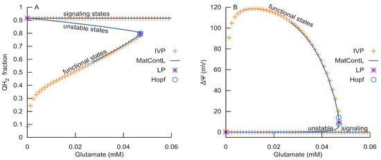 Figure 11 displays a bifurcation diagram showing the steady state with the model, including a reduced fraction of the ubiquinone pool (QH2) and mitochondrial membrane potential (Δψ) as functions of glutamate concentration. When the RC is in an ATP-producing state (designated in the figure as “functional”, since it is the main functional state), the increase in glutamate concentration results in the continuous rise in the reduced fraction of the ubiquinone pool (QH2, Figure 11A), which, due to mass conservation, leads to the corresponding decrease in the oxidized (Q) form. Such a decrease in the substrate acceptor for complex III results in a continuous decrease in Δψ (Figure 11B). However, the ATP-producing branch is terminated on the right by three critical bifurcation points separated by small distances—two Hopf bifurcations and one limit point, as revealed using MatcontL [17,18]. Crossing any of these points results in a discontinuous change in steady states from an ATP-producing branch to an ROS-producing branch (designated in the figure as “signaling”, since ROS produced in this state play a signaling role). A branch of the unstable steady states connects the ATP-producing and ROS-producing branches.