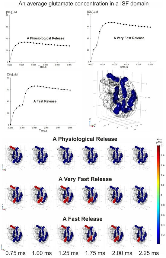 Having solved the boundary problem (2), the spatial–temporal gradient of glutamate in ISF can be obtained. This gradient illustrates the alterations in the concentration of this metabolite that occur due to the release of vesicles from the presynaptic terminal into the synaptic space. This case corresponds to a physiological condition involving the simultaneous release of the presynaptic vesicles in all five synapses. Subsequent control over the activation of excitatory receptors for glutamate is enhanced by the quantity of glutamate that is released [38]. Cells, neurons, and astrocytes are all involved in the process of eliminating glutamate from the interstitial fluid through specialized transport proteins [39]. Then, intracellular metabolic cycles result in the conversion of glutamate into glutamine [40]; this occurs alongside multiple signaling cascades that promote excitotoxic effects [41]. When conditions are normal, the release of glutamate occurs at a medium level, and the transport and metabolic mechanisms are sufficient to manage any surplus of this neurotransmitter [42,43].