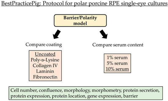 Age-related macular degeneration (AMD) is the main cause of blindness in Western nations. AMD models addressing specific pathological pathways are desired. Through this study, a best-practice protocol for polarized porcine single-eye retinal pigment epithelium (RPE) preparation for AMD-relevant models of RPE barrier and polarity is established. Single-eye porcine primary RPE cells (from one eye for one well) were prepared in 12-well plates including Transwell inserts. Different coatings (laminin (Lam), Poly-ᴅ-Lysine (PDL), fibronectin (Fn) and collagens) and varying serum contents (1%, 5% and 10%) were investigated to determine optimal culture parameters for this model. Success rates of cultures, cell number (trypan-blue exclusion assay), morphology/morphometry (light and fluorescence microscopy), protein secretion/expression (ELISA, Western blot), gene expression (qPCR), transepithelial electric resistance (TEER) and polar location of bestrophin 1 (BEST1) by cryosectioning (IHC-Fr) were assessed. Cells seeded on Lam exhibited the highest level of epithelial cells and confluence properties. Fn resulted in the highest cell number growth. Lam and Fn exhibited the highest culture success rates. TEER values and vascular endothelial growth factor secretion were highest when Lam was used. For the first time, polar (Transwell) porcine single-eye RPE morphometry parameters were determined. RPE on Lam showed bigger cells with a higher variety of cell shapes. CIV displayed the lowest claudin 19 expression. The highest basolateral expression of BEST1 was achieved with Lam coating. The higher the serum, the better the cell number increase and confluence success. A reduction in serum on Lam showed positive results for RPE morphology, while morphometry remained stable. A five percent serum on Lam showed the highest culture success rate and best barrier properties. RPE65 expression was reduced by using 10% serum. Altogether, the most suitable coating of Transwell inserts was Lam, and a reduction in serum to 5% is recommended, as well as a cultivation time of 28 days. A protocol for the use of polar porcine single-eye cultures with validated parameters was established and is provided herein.
