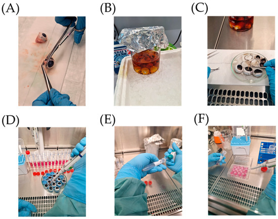 Polar single-eye RPE preparation from porcine eyes. (A) Cleaning eyes from adjacent tissue, (B) storing eyes in cold NaCl, (C) opening eyes and removing vitreous body and retina, (D) trypsinization of eyes, (E) washing and centrifugation, and (F) seeding cells on Transwell inserts.