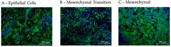 Porcine single-eye RPE cells were cultivated on Transwell inserts coated with Lam or non-coated ones with different serum contents (1%, 5%, 10%) for 7 (Figure 15A), 14 (Figure 15B) and 28 (Figure 15C) days. Light microscope imaging of the individual wells was conducted to determine the portion in percent of epithelial cells, mesenchymal cells and undivided cells plus gaps between cells. The whole morphological assessment is depicted in Supplementary Materials (Figure S2). Here, our focus is on epithelial morphology.