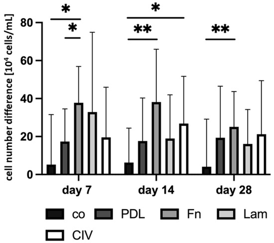 Cell number difference with different coatings. After a cultivation time of 7, 14 and 28 days, porcine single-eye retinal pigment epithelium cells were counted. They were seeded on non-coated wells (co), Poly-ᴅ-Lysine (PDL), fibronectin (Fn), laminin (Lam) or collagen IV (CIV). Change in cell number ×104/mL at respective time points is shown. Data show normal distribution, mean and standard deviation. Between each condition, significances were determined via analysis of variance (ANOVA) and Student’s t-test. * p < 0.05, ** p < 0.01. n = 7–48.