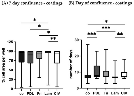 Confluence with different coatings. Porcine single-eye retinal pigment epithelium cells were cultured on non-coated wells (co), Poly-ᴅ-Lysine (PDL), fibronectin (Fn), laminin (Lam), or collagen IV (CIV). On the 7th day of cultivation, confluent cell growth area was determined by light microscopy in % of the whole well (A). In addition, day of full confluence was determined (B). Data are non-parametric; median, interquartile range and range from minimum to maximum are depicted. Between each group, significances were calculated with the Kruskal–Wallis test followed by Mann–Whitney test. * p < 0.05, ** p < 0.01, *** p < 0.001. n = 45–89.