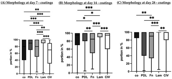 After seven days of cultivation, Lam showed the highest portion of epithelial cells, which was significantly higher than co (p < 0.001), PDL (p = 0.002), Fn (p < 0.001) or CIV (p < 0.001). Conversely, CIV had significantly lesser epithelial cells than Fn (p = 0.003), PDL (p < 0.001) or co (p = 0.005). After 14 days of cultivation, Lam once again showed the highest portion of epithelial cells. Also, Fn had lesser epithelial cells than PDL (p = 0.008) and co (p = 0.034). After 28 days of cultivation, Lam showed complete epithelial morphology, with other conditions showing more similar results but higher variation. Also, co had more epithelial cells than Fn (p = 0.003). Altogether, Lam showed the best epithelial morphological differentiation at all time points assessed, while other morphology parameters were low. Descriptively, Lam showed the lowest portion of mesenchymal cells, undivided cells and ungrown areas on day 7, which corresponds to the efficient confluence activities of Section 3.1.2 (Figure S1). On day 28, Lam had the lowest portion of undivided cells and ungrown areas as well (refer Figure S1). Fn, in contrast, showed high portions of mesenchymal and undivided cells as well as ungrown areas for all time points (Figure S1).