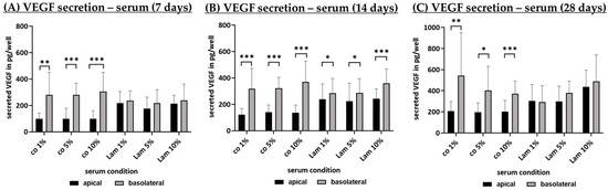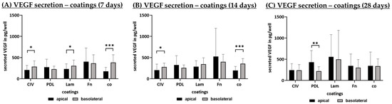 VEGF secretion with different coatings. Porcine single-eye retinal pigment epithelium cells were cultivated on Transwell inserts coated with collagen IV (CIV), laminin (Lam), Poly-ᴅ-Lysine (PDL), fibronectin (Fn) or non-coated wells (co) for 7 (A), 14 (B) and 28 (C) days. Apical and basolateral supernatants were harvested for four hours at different cultivation times and applied in ELISA to determine vascular endothelial growth factor A (VEGF) secretion in pg per well area. Data were parametric; mean and standard deviation are depicted. Between each group, significances were first calculated with analysis of variance (ANOVA) followed by Student’s t-test. * p < 0.05, ** p < 0.01, *** p < 0.001. n = 14–19.
