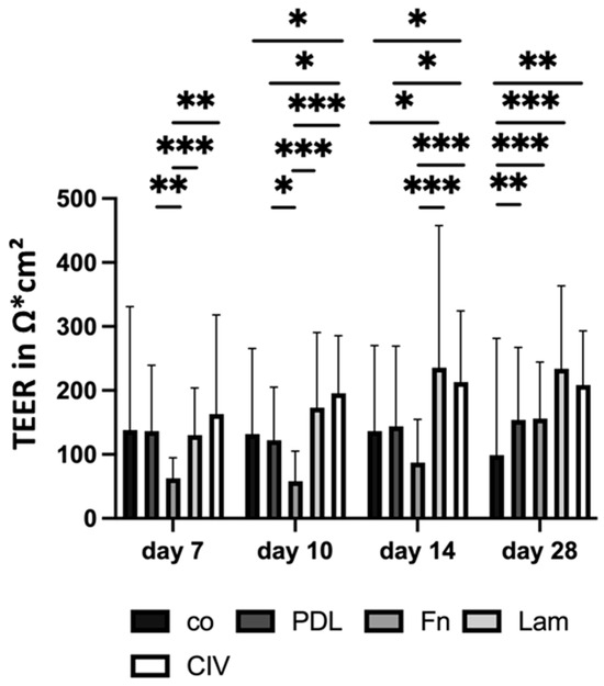 Cell barrier with different coatings. Porcine single-eye retinal pigment epithelium cells were cultivated on Transwell inserts non-coated (co) or coated with Poly-ᴅ-Lysine (PDL), fibronectin (Fn), laminin (Lam) or collagen IV (CIV) for 7, 10, 14 and 28 days. Transepithelial electrical resistance (TEER) was measured. Data were parametric; mean and standard deviation are depicted. Between each group, significances were calculated with analysis of variance (ANOVA) followed by Student’s t-test. * p < 0.05, ** p < 0.01, *** p < 0.001. n = 9–62.