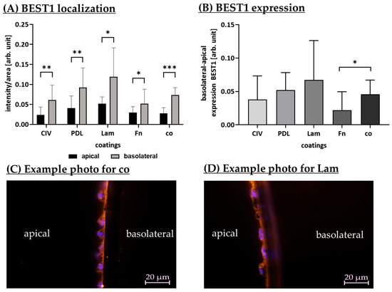 Bestrophin-1 localization and expression. Porcine single-eye retinal pigment epithelium cells were cultivated on Transwell inserts coated with collagen IV (CIV), laminin (Lam), Poly-ᴅ-Lysine (PDL), fibronectin (Fn), or non-coated wells (co) for 28 days. Cryosectioning of Transwell inserts was performed and stained for bestrophin-1 (BEST1) expression. Example photos for co (C) and Lam (D) are depicted (green = cell nuclei, orange = BEST1, objective = 63×; scale bar = 20 µm). Apical and basolateral expression was detected and evaluated with Fiji. Apical and basolateral fluorescence intensity normalized by fluorescence area (A) as well as relative basolateral and apical normalized fluorescence intensity (B) are shown. Data were parametric; mean and standard deviation are depicted. Between each group, significances were first calculated with analysis of variance (ANOVA) followed by Student’s t-test. * p < 0.05, ** p < 0.01, *** p < 0.001. n = 6–14.