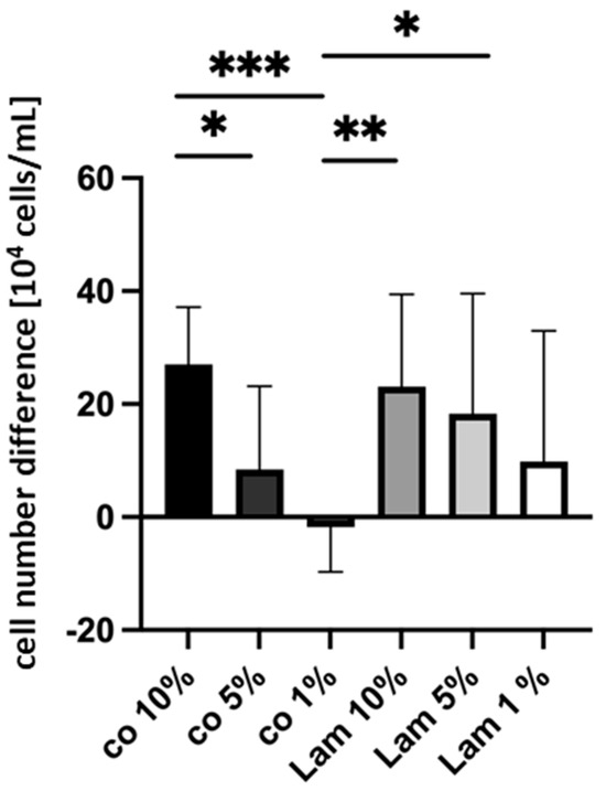 Porcine single-eye cells from RPEs were cultivated on Lam or non-coated wells (co) with different serum contents of 1%, 5% or 10%, and cell numbers before seeding and after 14 days were determined. Fourteen days were selected as the most meaningful time point for cell number differences, as cell numbers at 7 days display high variation, and after 28 days, are all similar due to full cell confluence. Cell number differences are shown in Figure 13. Cell number differences increased with higher serum content; cell number difference with co 1% was negative, which was significantly lower than co 10% (p < 0.001), Lam 10% (p = 0.005), or Lam 5% (p = 0.043). Also, co 10% showed a significantly higher cell number increase than co 5% (p = 0.042). A higher serum content results in higher cell number growth.