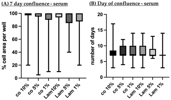 Confluence depending on serum content. Porcine single-eye retinal pigment epithelium cells were cultured on laminin (Lam), or non-coated wells (co) with different serum content (1%, 5%, 10%). On the seventh day of cultivation, confluent cell growth area was determined by bright field microscopy in % of the well (A). Also, day of full confluence was determined (B). Data are non-parametric; median, interquartile range and range from minimum to maximum are depicted. Between each group, significances were calculated with Kruskal–Wallis test followed by Mann–Whitney test. No significant findings were found. n = 22–40.