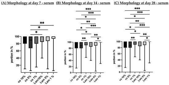 Cell morphology depending on serum content. Porcine single-eye retinal pigment epithelium cells were cultured on laminin (Lam) or non-coated wells (co) with different serum contents (1%, 5%, 10%). After 7 (A), 14 (B) and 28 (C) days, the portion of epithelial areas of the individual wells was determined with bright field microscopy photos. Data are non-parametric; median, interquartile range and range from minimum to maximum are depicted. Between each group, significances were calculated with Kruskal–Wallis test followed by Mann–Whitney test. * p < 0.05, ** p < 0.01, *** p < 0.001. n = 48–54.