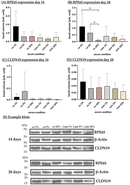 Concerning the 14th day, CLDN19 expression (Figure 9A) was increased with no-coating control co and decreased with CIV coating, but no significance could be found. RPE65 expression (Figure 9C) was increased with co and lowered with Lam, but no significances were reached. After 28 days of cultivation, the expressed CLDN19 (Figure 9B) was, again, highest with co and lowest with CIV, which was significantly lower than CLDN19 expression on PDL (p = 0.049) and Fn (p = 0.031). RPE65 expression was highest with Lam coating and lowest with PDL coating, with no significant findings. Overall, the expression of the assessed proteins varied between the wells, indicating that the origin of the RPE cells had a stronger influence on its quantitative expression than the coatings used, with the exception of CIV, which seem to result in a lower expression of CLDN19.