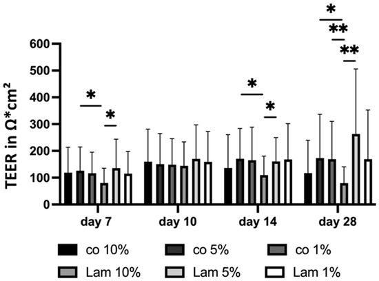 Based on the results obtained in Section 3.2. (serum content tests) Lam-coated Transwell cultures were used compared to co (non-coated wells) as Lam proved to be the best coating substance.