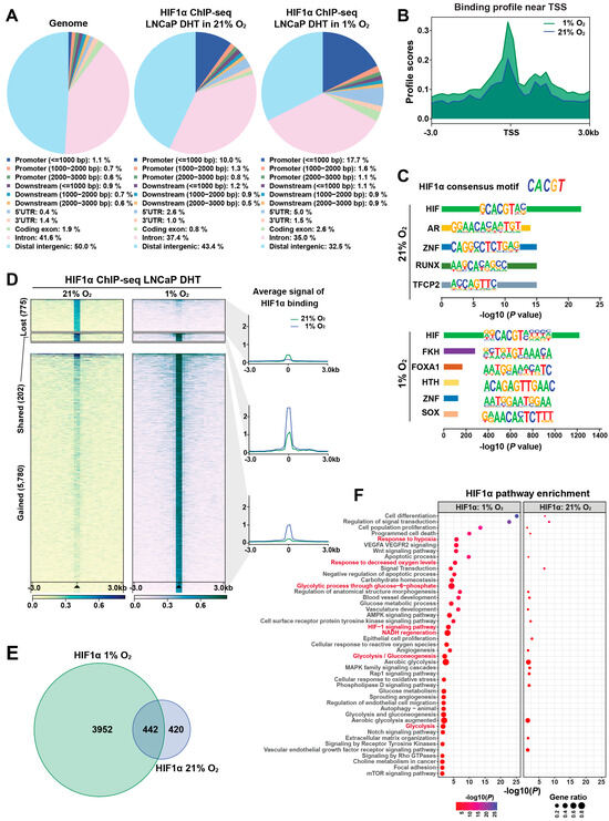 To investigate the role of HIF1α in transcriptional reprogramming under hypoxia, we used LNCaP 1F5 prostate cancer cells [38], which constitutively express high levels of HIF1α. ChIP-seq profiling was performed to map genome-wide HIF1α-binding sites under both normoxic and hypoxic conditions. Peak calling using MACS [39] and HOMER [28] algorithms identified approximately 1000 high-confidence HIF1α-binding sites under normoxia, expanding markedly to ~6000 peaks under hypoxia. Comparative genomic annotation revealed that HIF1α binding was significantly enriched at promoter regions. Under normoxia, 10% of peaks were localized within 1 kb upstream of transcription start sites (TSSs) and 2.6% in 5′ UTRs. Upon hypoxic stimulation, these proportions increased to 17.7% and 5.0%, respectively (Figure 1A), indicating extensive oxygen-dependent reprogramming of HIF1α occupancy near gene promoters.