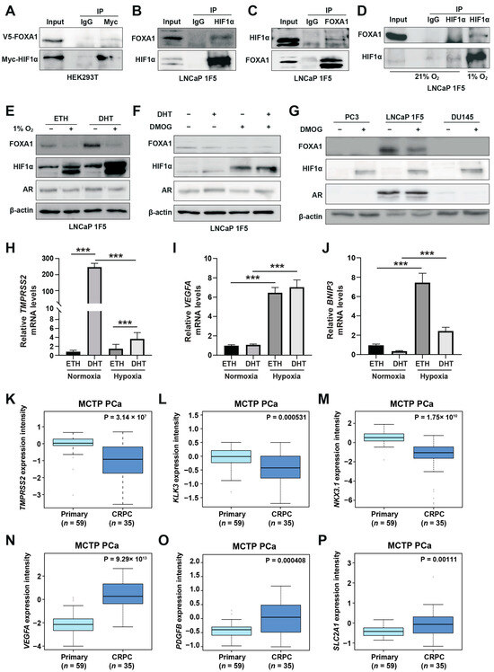 HIF1α physically interacts with and destabilizes FOXA1 in response to hypoxic stress in prostate cancer cells. (A) Co-immunoprecipitation (Co-IP) assay in HEK293T cells transiently co-transfected with Myc-tagged HIF1α and V5-tagged FOXA1 constructs for 48 h. Protein complexes were immunoprecipitated using an anti-Myc antibody, and both input and co-IP fractions were subjected to immunoblotting with anti-V5 and anti-Myc antibodies to confirm physical interaction between HIF1α and FOXA1. (B,C) Endogenous interactions between HIF1α and FOXA1 in LNCaP 1F5 cells were validated by reciprocal Co-IP using anti-HIF1α (B) and anti-FOXA1 (C) antibodies, followed by western blot analysis. (D) Hypoxia enhances the HIF1α–FOXA1 interaction in LNCaP 1F5 cells. Cells were cultured under normoxic or hypoxic (1% O2) conditions for 24 h, followed by co-IP using anti-HIF1α antibody and immunoblotting with anti-FOXA1 and anti-HIF1α antibodies. (E) Western blot analysis of LNCaP 1F5 cells treated with or without 100 nM dihydrotestosterone (DHT) under hypoxic (1% O2) conditions for 24 h. Protein levels of FOXA1, HIF1α, and other indicated markers were assessed to examine hormone–hypoxia crosstalk. (F,G) Western blot analysis of FOXA1 and HIF1α protein expression in LNCaP 1F5 cells, (F) as well as castration-resistant prostate cancer cell lines PC3 and DU145 (G) treated with DHT (100 nM, 24 h) and/or the HIF stabilizer DMOG (50 μM, 6 h), demonstrating modulation of FOXA1 stability in response to HIF1α activation across prostate cancer models. (H–J) Quantitative RT-PCR analysis of TMPRSS2 (H) and canonical HIF1α target genes VEGFA and BNIP3 (I,J) in LNCaP 1F5 cells treated with or without DHT (100 nM) and hypoxia (1% O2) for 24 h. Results represent mean ± SD of three independent experiments. *** p < 0.001 by Student’s t-test. (K–M) Expression profiling of AR transcriptional targets between primary prostate cancer and CRPC, including TMPRSS2 (K), KLK3 (L), and NKX3.1 (M). (N–P) Comparative analysis of HIF1α transcriptional targets in primary prostate cancer and CRPC.