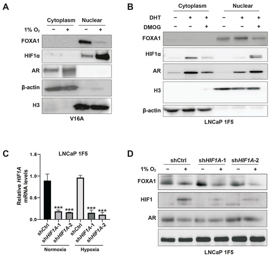 HIF1α mediates hypoxia-induced suppression of FOXA1 protein in prostate cancer cells. (A) V16A cells were exposed to normoxic (21% O2) or hypoxic (1% O2) conditions for 24 h. Cytoplasmic and nuclear fractions were isolated and analyzed by western blotting to assess subcellular localization and expression levels of FOXA1 and related proteins in response to hypoxia. (B) LNCaP 1F5 cells were treated with the HIF prolyl hydroxylase inhibitor DMOG (50 μM) for 6 h to stabilize HIF1α under normoxia. Cytoplasmic and nuclear extracts were analyzed by western blotting, revealing decreased FOXA1 protein levels upon HIF1α stabilization. (C) Quantitative RT-PCR analysis of HIF1A mRNA expression in LNCaP 1F5 cells transduced with control or HIF1A-targeting shRNA. Cells were cultured under normoxia or hypoxia (1% O2, 24 h). Data represent mean ± SD from three independent experiments. *** p < 0.001, Student’s t-test. (D) Knockdown of HIF1α in LNCaP 1F5 cells using lentiviral shRNA abrogates hypoxia-induced FOXA1 protein suppression. Cells were treated under normoxic or hypoxic conditions (1% O2, 24 h), and protein expression of FOXA1, HIF1α, and AR was assessed by western blotting.