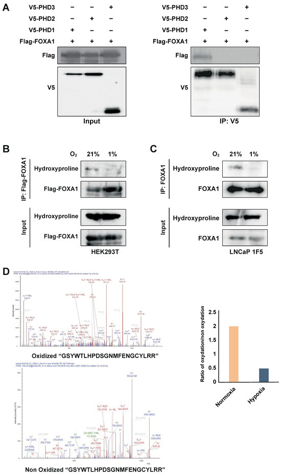 PHD enzymes catalyze proline hydroxylation of specific protein substrates in an oxygen-dependent manner [15,20,47,48]. To determine whether PHD1-mediated interaction leads to FOXA1 hydroxylation, we overexpressed Flag-tagged FOXA1 in HEK293T cells and subjected the cells to normoxic or hypoxic conditions (1% O2, 24 h). Immunoprecipitation of FOXA1 followed by immunoblotting with a hydroxyproline-specific antibody revealed robust hydroxylation of FOXA1 under normoxia, which was significantly reduced upon hypoxic treatment (Figure 5B). These findings were validated in LNCaP 1F5 cells, where FOXA1 hydroxylation similarly decreased under hypoxia (Figure 5C), confirming the oxygen dependency of this modification in a prostate cancer context.
