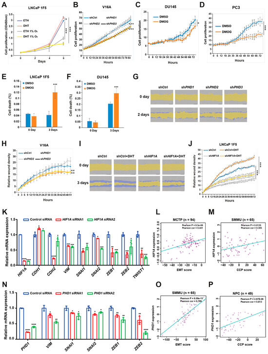 HIF1α and prolyl hydroxylases modulate prostate cancer cell proliferation and migration. (A) LNCaP 1F5 cells were cultured under normoxic or hypoxic (1% O2) conditions with or without dihydrotestosterone (DHT), and cell proliferation was quantified using the XTT assay by measuring absorbance at 450 nm. (B) V16A cells with stable knockdown of PHD1, PHD2, or PHD3 were monitored using the IncuCyte™ Zoom live-cell imaging system. Proliferation dynamics were assessed by quantifying percent confluence every 3 h. (C,D) Proliferation kinetics of DU145 (C) and PC3 (D) cells treated with the pan-prolyl hydroxylase inhibitor DMOG (50 μM) were measured via live-cell imaging (IncuCyte™), with confluence recorded at 3 h intervals over a 72 h period. (E–F) Viability analysis of LNCaP 1F5 (E) and DU145 (F) cells treated with DMOG (50 μM), visualized by phase-contrast and fluorescent microscopy using a live/dead viability dye. Quantification of dead cells was performed in DU145 and PC3 cells after 72 h of treatment. (G–J) Cell migration assays were conducted in PHD1-, PHD2-, and PHD3-knockdown V16A cells (G,H) and HIF1A-knockdown LNCaP 1F5 cells (I,J) using the IncuCyte™ platform to evaluate real-time motility. Data are representative of at least three independent biological replicates. (K) RT-qPCR analysis was performed to elucidate the relationship between the expression of HIF1A and genes associated with EMT. (L,M) Correlation of HIF1A expression with EMT score (L) or cell cycle progression (CCP) score (M) across distinct prostate cancer cohorts. (N) mRNA expression analysis of EMT-associated genes following PHD1 knockdown. (O,P) Correlation of PHD1 expression with EMT score (O) or cell cycle progression (CCP) score (P) across distinct prostate cancer cohorts. Statistical significance was assessed using appropriate tests, with p-values indicated as * p < 0.05, ** p < 0.01, *** p < 0.001, **** p < 0.0001.