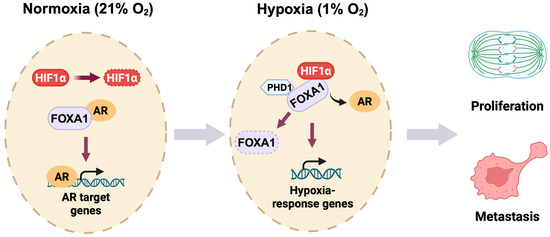 Taken together, these findings establish HIF1α, PHD1, and PHD3 as positive regulators of prostate cancer cell proliferation and migration. The coordinated control of FOXA1 stability by these factors links oxygen sensing to androgen signaling and highlights a regulatory axis that may contribute to tumor progression and metastatic potential.