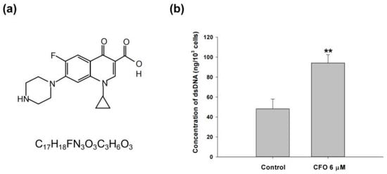 Double-stranded DNA (dsDNA) expression after ciprofloxacin treatment. The chemical formula and structure of the antibiotic ciprofloxacin (a). Mouse colorectal adenocarcinoma CT26 cells were managed with ciprofloxacin for 24 h, and the cytosolic dsDNA content was calculated by subtracting the amount of single-stranded DNA from that of the total DNA using spectrophotometer measurements (b). Data are presented as mean ± standard deviation and expressed relative to cells treated with vehicle alone. Statistically significant differences that compare the control with the ciprofloxacin-treated groups are indicated as ** p < 0.01.