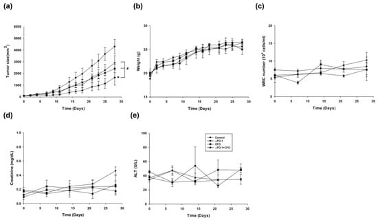 The curative effects and toxicities in the CT26 syngeneic animal tumor model after ciprofloxacin, anti-programmed cell death protein-1 (anti-PD1), and ciprofloxacin combined with anti-PD1 treatment. CT26 colorectal cells were implanted into the hind limb of BALB/c mice. After the tumor reached a size of 0.5 cm, the mice were administered with ciprofloxacin, anti-PD1 antibody, or ciprofloxacin combined with anti-PD1 antibody. The tumor size was recorded by a single observer and calculated (a). Toxicities were assessed by body weight (b), white blood cells (WBCs) for hematological parameter (c), creatinine for renal function (d), and alanine aminotransferase (ALT) for liver function (e). Data are presented as mean ± standard deviation and expressed relative to cells treated with the vehicle alone. Statistically significant differences between the control and combination-treated groups are indicated as * p < 0.05. Statistically significant differences between the single agent-treated and combination-treated groups are indicated as # p < 0.05.