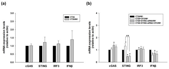 The mRNA expression of proteins in the cGAS-STING pathway signaling pathway after STING siRNA or ciprofloxacin treatment in the CT26 and mouse M1 macrophage co-culture system. Mononuclear cell layers were isolated from the mice spleen, and M1 macrophages were induced by exposure to lipopolysaccharide and interferon-γ. The M1 macrophages were co-cultured with CT26 cells, and the mRNA expression of cGAS, STING, IRF3, and IFNβ in CT26 cells was quantitated using gene-specific primers (a). Treatment with ciprofloxacin (CFO), siRNA STING, and ciprofloxacin plus siRNA STING in the CT26/M1 macrophage co-culture system. The mRNA expression of target genes was quantitated using gene-specific primers (b). Data are presented as mean ± standard deviation and expressed relative to cells treated with CT26 or CT26/M1 macrophage alone. Significant differences between the control and treatment groups are indicated as * p < 0.05. Significant differences between the ciprofloxacin-treated group and the STING siRNA or STING siRNA plus ciprofloxacin-treated groups in the co-culture system are indicated as ## p < 0.01.