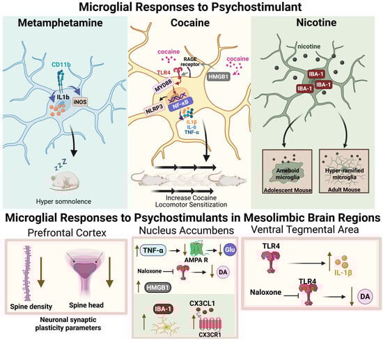 Overview of psychostimulant effects on microglia across brain regions. This figure illustrates the key mechanisms discussed in Section 5 of the review, summarizing the effects of methamphetamine, cocaine, and nicotine on microglia (upper panel) and mesolimbic brain regions (lower panel). Panels are color-coded to match each drug with its associated effects: methamphetamine (blue), cocaine (yellow), and nicotine (green). Upper panel—microglial effects. Left: Methamphetamine increases CD11b expression in microglia, leading to elevated IL-1β levels and prolonged inducible nitric oxide synthase (iNOS) activity within CD11b+ cells []. Additionally, methamphetamine-induced hypersomnolence has been associated with CD11b+ microglial activation, as indicated by the blue arrows []. Middle: Cocaine activates microglia through multiple inflammatory pathways. Direct binding to Toll-like receptor 4 (TLR4) initiates MYD88 and NF-κB signaling (red arrow), resulting in increased IL-6, IL-1β, and TNF-α expression (purple arrow). NF-κB activation can also occur independently of TLR4. Cocaine also increases release of high-mobility group box 1 (HMGB1), which signals via the receptor for advanced glycation end products (RAGE), a receptor interacting with several TLRs []. Cocaine also engages in other inflammatory cascades, such as the NLRP3 inflammasome by the activation of nuclear receptors. Microglial activation has been shown to be essential for cocaine-induced behavioral sensitization []. Right: Nicotine increases IBA-1 expression in microglia. It has a developmental stage-dependent effect on microglial morphology: in adolescent animals, nicotine promotes an amoeboid morphology, while in adults, it induces a more ramified phenotype []. Lower panel—brain region effects. Right (PFC): Cocaine (yellow) reduces dendritic spine density and spine head diameter in the prefrontal cortex (PFC) []. Middle (NAc): Cocaine-induced TNF-α elevation in the nucleus accumbens (NAc) promotes AMPA receptor reinsertion, reducing glutamatergic signaling [,]. These effects are TLR4-dependent and are blocked by (+/−)-naloxone, which also reduces dopaminergic signaling. Cocaine also increases HMGB1, specifically in the NAc []. Nicotine (green) within the NAC induces an increase in IBA-1+ microglia in the NAc and upregulates CX3CL1–CX3CR1 signaling, which is essential for nicotine’s effects during adolescence [,]. The CX3CL1-CX3CR1 signaling was shown to be essential for the effects of nicotine in adolescence. Left (VTA): In the ventral tegmental area (VTA), cocaine effects are also mediated through TLR4, with (+/−)-naloxone again blocking TLR4 and dampening dopaminergic activity. Cocaine increases TLR4 expression in VTA microglia, elevating IL-1β and contributing to an inflammatory state []. Overall, the figure summarizes the main points of the review, showing how microglia is involved in different psychostimulants’ activity. Figure made using BioRender.com.