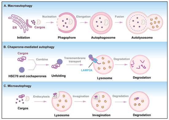 The three different types of autophagy. (A) Macroautophagy: Macroautophagy is the most common form of autophagy within cells, which can be divided into four stages: formation of the phagophore, formation of the autophagosome, transport and fusion of the autophagosome, and degradation of the autophagosome. (B) Chaperone-mediated autophagy: Substrate proteins directly enter the lysosome for degradation with the assistance of molecular chaperones such as LAMP2A. (C) Microautophagy: The lysosomal membrane undergoes deformation and directly takes the substrates in the cytoplasm into the lysosome for degradation. The invagination of the lysosome directly engulfs the cytoplasmic components.