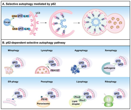 Mechanistically, autophagy is tightly regulated by a hierarchical network of autophagy-related (ATG) proteins and signaling pathways []. In mammals, core ATG proteins orchestrate autophagosome formation through sequential recruitment to pre-autophagosomal structures [], including the UNC-51-like kinase 1 (ULK1) initiation complex (ULK1–FIP200–ATG13–ATG101), the PI3K complex I, ATG12–ATG5 conjugation systems, and LC3 lipidation machinery [,,]. The AMPK–mTOR–ULK1 axis is a central autophagy induction regulatory hub [,]. Under metabolic stress, AMP-activated protein kinase (AMPK) activation phosphorylates ULK1 (Ser317/Ser777) to initiate autophagy [], while nutrient sufficiency activates mTOR to suppress ULK1 via phosphorylation at Ser757 []. This dual regulation ensures precise adaptation to cellular energy status. According to substrate specificity, autophagy can be classified into two types: selective and non-selective. Non-selective autophagy randomly engulfs cytosol during starvation to replenish nutrients []. Conversely, selective autophagy employs receptors (p62, NDP52, OPTN) that simultaneously bind ubiquitinated cargo (damaged organelles, protein aggregates) and LC3 on phagophores []. p62 is a crucial selective autophagy receptor that facilitates the elimination of damaged organelles and protein aggregates. It plays an essential mediator in several types of selective autophagy, including mitophagy (elimination of mitochondria), pexophagy (peroxisome removal), ER-phagy (the clearance of ER), ribophagy (the clearance of ribosome), lysophagy (damaged lysosome clearance), and nucleophagy (the clearance of nuclear component) (Figure 2) [,]. The p62-mediated degradation mechanism is essential for maintaining cellular homeostasis, highlighting the significance of p62 in selective autophagy.