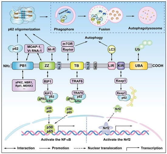 p62 is a 440 amino acid protein and contains multiple domains, including the N-terminal Phox and Bam1p domain (PB1 domain), the ZZ-type zinc finger domain (ZZ domain), the tumor necrosis factor receptor-associated factor 6 (TRAF6 domain) binding domain (TB domain), the LC3 interaction domain (LIR domain), the Keap1 interaction domain (KIR domain), and the C-terminal ubiquitin (Ub)-related domain (UBA domain) (Figure 3) []. In addition, p62 also has two nuclear localization signals (NLSs) and a nuclear export signal (NES). The multiple structural domains of p62 underlie its diverse functional roles [].