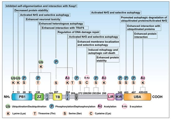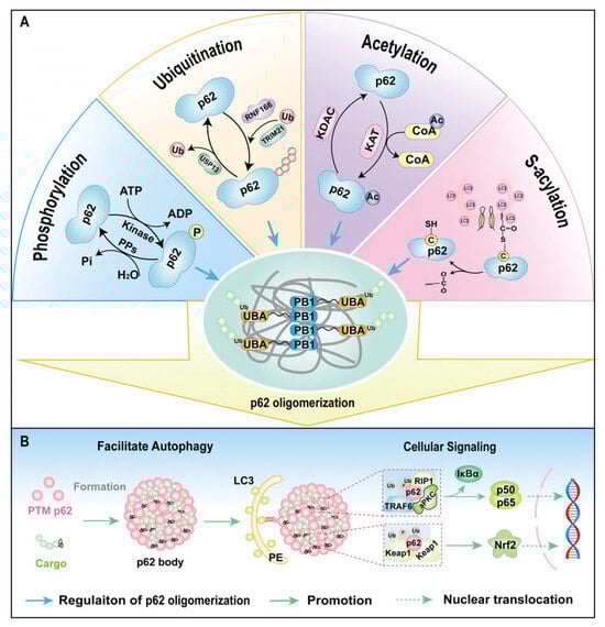 Post-translational modifications (PTMs) encompass covalent biochemical alterations after protein biosynthesis, including amino acid side chain modifications and terminal group processing. These enzymatic modifications (including phosphorylation, acetylation, ubiquitination, SUMOylation, and others) dynamically regulate protein stability, subcellular localization, macromolecular interactions, and functional states through specific chemical group additions or removals []. p62’s dual roles as an autophagy receptor and signaling hub are tightly regulated through distinct PTMs, including phosphorylation, acetylation, ubiquitination, and S-acylation [,,]. For example, phosphorylation enhances p62 binding to ubiquitinated substrate binding, acetylation modulates p62 oligomerization states, and S-acylation controls p62 liquid–liquid phase separation dynamics. These modifications collectively regulate p62’s capacity to bridge ubiquitinated cargoes with autophagosomal membranes, nucleate self-polymerizing condensates through PB1 domain interactions, and coordinate crosstalk between autophagy and major signaling pathways. In this review, we systematically summarize the ways in which the multifunctionality of p62 is critically regulated by key PTMs, including phosphorylation, ubiquitination, acetylation, and S-acetylation. Specifically, we clarify the mechanistic effects of these PTMs on p62’s functional roles in selective autophagy, diverse signaling pathways, and cellular stress responses. Finally, we explore the dynamic regulation of p62 oligomerization by PTMs, elucidating their dual impact on autophagy modulation and stress adaptation mechanisms.