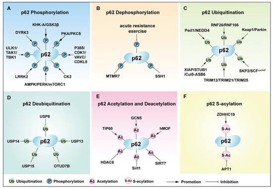 Regulators are involved in the post-translational modification and regulation of p62. (A) Regulatory factors affecting the phosphorylation of p62. (B) Regulatory factors affecting the dephosphorylation of p62. (C) Regulatory factors affecting the ubiquitination of p62. (D) Regulatory factors affecting the deubiquitination of p62. (E) Regulatory factors affecting the acetylation/deacetylation of p62. (F) Regulatory factors affecting the S-acetylation of p62.