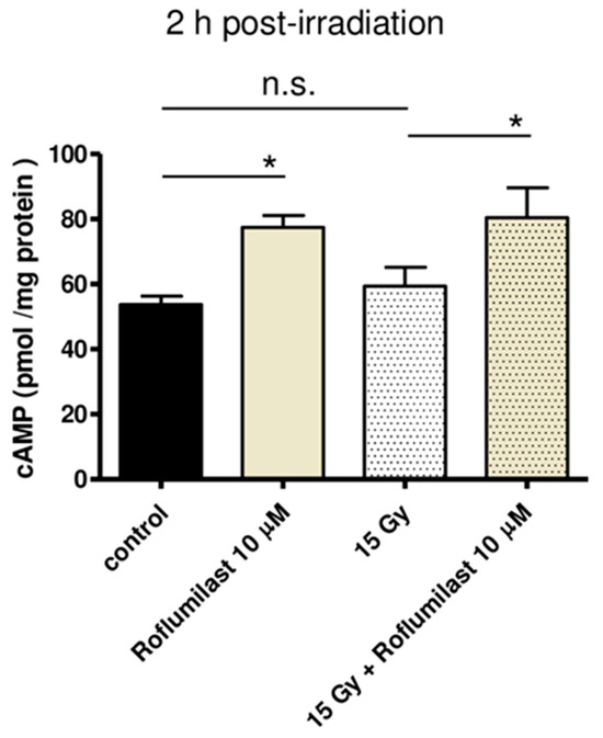 Effect of Roflumilast on cAMP concentration in control (non-irradiated) and high-dose (15 Gy)-irradiated HPMECs. Cell lysis was performed 2 h after irradiation. Global cAMP concentration was measured in cell lysates prepared from control and irradiated HPMECs treated or not with Roflumilast (10 µM) after irradiation. Data on graph represent the average of data from three experiments (* p < 0.05, n.s.: not significant).