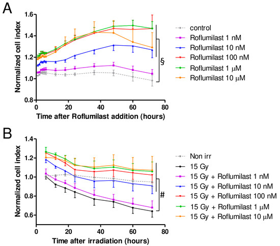 After exposure to X-rays, the observed slow decrease in the impedance of endothelial monolayers corresponds to progressive endothelial barrier disruption and may be related to the loss of apoptotic cells, to the weakening of endothelial junctions, and to the formation of gaps between endothelial cells of the monolayer [20,35]. From 24 to 72 h after irradiation, the rate of irradiation-induced impedance decrease was significantly reduced upon Roflumilast treatment, indicating that this compound protects the endothelial barrier from the deleterious effects of irradiation. In the time course of experiments, this effect of Roflumilast may be explained by its protective action against apoptosis-related loss of monolayer cells, by the reduction in intercellular gaps, and by the stabilization/strengthening of endothelial adherens junctions associated with its protective effects on the actin cytoskeleton.