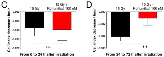 Effect of Roflumilast and irradiation on cell index/impedance of confluent HPMEC monolayers. (A) Average cell index values in HPMEC monolayers from 1 to 72 h after treatment with Roflumilast (1 nM, 10 nM, 100 nM, 1 µM and 10 µM). Average cell index values of non-treated HPMEC monolayers (control) are also represented. Data on graph represent average values from five experiments. (B) Average cell index values between 6 and 72 h after irradiation in irradiated HPMECs monolayers treated or not with Roflumilast (1 nM, 10 nM, 100 nM, 1 µM and 10 µM) after irradiation. Average cell index values of non-irradiated HPMECs monolayers (control) are also represented. Data on graph represent average values from five experiments. §: Average values for Roflumilast (≥10 nM)-treated HPMEC monolayers are significantly higher than those of the control from 1 to 72 h after Roflumilast addition (from p < 0.05 to p < 0.001 depending on time after Roflumilast addition). #: Average values for 15 Gy + Roflumilast (≥10 nM) are significantly higher than the 15 Gy average values from 6 to 72 h after irradiation (from p < 0.05 to p < 0.001 depending on time after irradiation). (C) Average cell index decrease per hour (slope) calculated owing to linear regression of normalized cell index data (15 Gy and 15 Gy + Roflumilast 100 nM) from 6 to 24 h after irradiation (n.s.: not significant). (D) Average cell index decrease per hour (slope) calculated owing to linear regression of normalized cell index data (15 Gy and 15 Gy + Roflumilast 100 nM) from 24 to 72 h after irradiation (** p < 0.01).