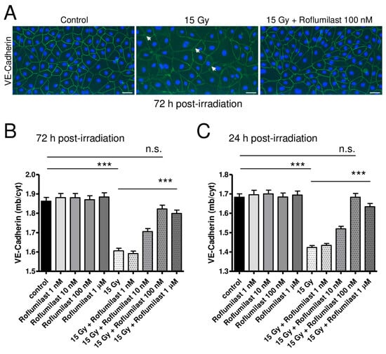 To investigate the effects of high-dose irradiation and Roflumilast on adherens junctions, confluent HPMEC monolayers were stained with an anti-VE-Cadherin antibody 72 h after irradiation. As illustrated in Figure 3A, high-dose irradiation induced obvious alterations in VE-cadherin staining in HPMECs when compared to non-irradiated cells. While VE-cadherin staining at the plasma membrane was rather regular and bright in non-irradiated cells, it appeared weaker in high-dose-irradiated HPMECs, with numerous small gaps observed between disconnected cells of the monolayer (white arrows, Figure 3A). As a consequence, the ratio between plasma membrane and cytosol VE-Cadherin staining intensities was found to be significantly reduced in irradiated endothelial monolayers (Figure 3B). This indicates that plasma membrane expression of VE-Cadherin is decreased in HPMECs 72 h after irradiation, which may be related to its degradation or its displacement toward the cytosol of endothelial cells (Figure 3B) [5,15,18]. Notably, post-irradiation treatment with Roflumilast dose-dependently restored the plasma membrane expression of VE-Cadherin, as attested by the dose-dependent recovery of the ratio between plasma membrane and cytosol VE-Cadherin staining intensities in Roflumilast-treated endothelial monolayers (Figure 3B). Therefore, Roflumilast may either protect VE-Cadherin-composed adherens junctions or facilitate their reconstitution after irradiation. In non-irradiated cells, Roflumilast did not significantly alter the plasma membrane expression of VE-Cadherin (Figure 3B).