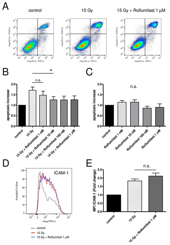 Effects of Roflumilast treatment on late apoptosis and ICAM-1 expression in control and high-dose-irradiated (15 Gy) HPMECs. (A) Analysis of apoptosis using flow cytometry in control HPMECs, after high-dose irradiation (15 Gy), and in irradiated HPMECs treated with Roflumilast (1 µM). All measurements were performed 72 h after irradiation. Quadrants drawn on pictures allows to measure the proportion of apoptotic cells (Annexin V+/PI+) among HPMECs populations. (B) Apoptosis after irradiation at a high dose (15 Gy) of HPMECs, and in irradiated HPMECs treated with Roflumilast (from 1 nM to 1 µM) after irradiation. Data on graph represent the average of seven experiments (* p < 0.05). (C) Basal apoptosis in control and Roflumilast-treated HPMECs. Data on graph represent the average of four experiments. (D) Histogram of ICAM-1 staining in control and 15 Gy-irradiated HPMECs, with or without Roflumilast (1 µM) treatment. (E) Normalized MFI values of ICAM-1 staining in irradiated HPMECs treated or not with Roflumilast (1 µM). Data on graph represent the average of four experiments (n.s.: not significant).