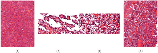 Tumoral growth pattern. (a) Acidophilic tumor with diffuse growth pattern; (b) Papillary growth pattern in longitudinal section, loose connective tissue with blood vessels in the center of the papilla; (c) Chromophobe tumor with alveolar growth pattern; (d) Trabecular growth pattern, with thick connective trabeculae inside the tumor.