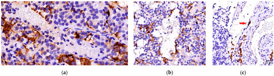 In the current study we analyzed the interactions between FS cells, blood vessels, and endothelial cells. In 27 of PitNETs GFAP-positive cells were concentrated in richly vascularized tumoral areas (small groups of cells or diffuse networks). Moreover, in 11 PitNETs presenting diffuse networks of FS cells, a direct interaction between endothelial cells and GFAP-positive cells (Figure 4) was noted.