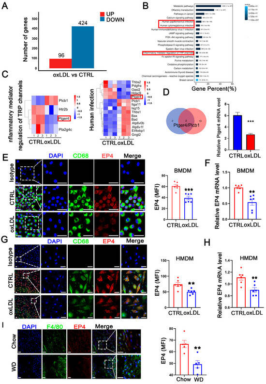 To investigate genes potentially involved in the pathological progression of atherosclerosis, we established an in vitro cell model using bone marrow-derived macrophages (BMDM) stimulated with oxidized low-density lipoprotein (oxLDL). Following 24 h of oxLDL stimulation, BMDMs were collected for RNA-sequencing. Compared to the control group, a total of 520 differentially expressed genes (DEGs) were identified, including 96 upregulated genes and 424 downregulated genes (Figure 1A). Subsequent gene set enrichment analysis (GSEA) and KEGG pathway enrichment analysis revealed that these DEGs were significantly enriched in inflammatory response pathways, such as human cytomegalovirus infection, human papillomavirus infection, and inflammatory mediator regulation of TRP channels (Figure 1B). By intersecting the gene sets enriched in the three pathways, two candidate genes, Ptger4 (EP4) and plcb1, were identified (Figure 1C,D), among which EP4 exhibited the highest fold change in RNA sequencing. The downregulation of the EP4 protein (Figure 1E,G) and mRNA (Figure 1F,H) was further confirmed in both BMDMs and HMDMs following oxLDL stimulation in vitro. To confirm the findings in vivo, atherosclerosis was induced in ApoE−/− mice by feeding a Western diet for 16 weeks. Immunofluorescence staining revealed significantly reduced EP4 expression in macrophages from Western diet-fed mice, compared to those fed on Chow diet (Figure 1I). Collectively, these results indicate that EP4 expression is downregulated in macrophages during atherogenesis.