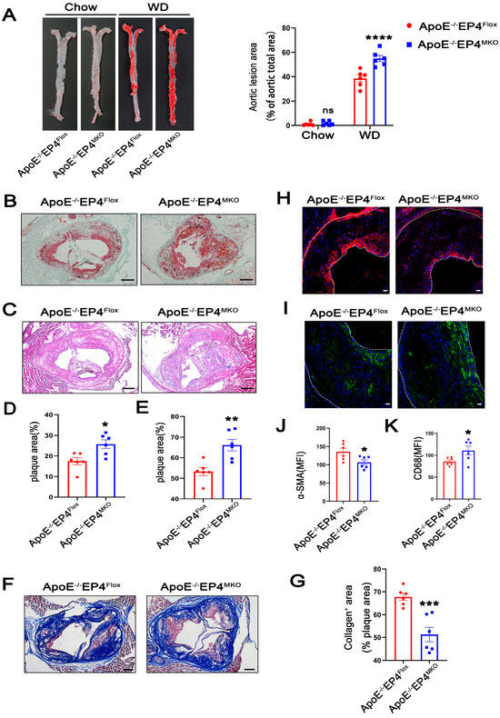 Plaque stability is a critical determinant of clinical outcomes during atherosclerosis, as unstable plaques are prone to rupture, leading to thrombosis and acute cardiovascular events [18]. To investigate whether macrophage EP4 deficiency affects plaque stability, collagen content within plaques was examined using Masson’s trichrome staining (red, muscle fibers; blue, collagen). As shown in Figure 2F,G, ApoE−/−EP4MKO mice showed a significant reduction in collagen content, suggesting compromised plaque stability. In addition, plaques from ApoE−/−EP4MKO mice displayed decreased expression of α-SMA (Figure 2H,J) and increased infiltration of CD68-positive macrophages (Figure 2I,K). Collectively, these data demonstrate that macrophage EP4 deficiency promotes atherosclerotic plaque progression and destabilization, highlighting its critical role in both lesion development and plaque stability.