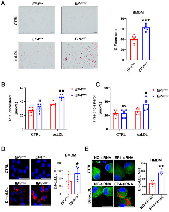Macrophage EP4 deficiency promotes foam cell formation. (A) Representative images and quantitation of Oil Red O-stained foam cells in EP4Flox and EP4MKO BMDMs after culture with or without oxLDL (50 μg/mL) (n = 6), scale bar: 50 μm. (B,C) Quantification of total cholesterol and free cholesterol accumulation in EP4Flox and EP4MKO BMDMs treated with or without oxLDL for 24 h (n = 6). Representative images and quantitation of Dil-labeled oxLDL uptake in BMDMs (D) (n = 7) and HMDMs (E) (n = 4). Nuclei were stained with DAPI (blue); EP4 was stained green. The fluorescence intensity was quantified by ImageJ, scale bar: 20 μm. Data presented as mean ± SEM, ns: not significant, * p < 0.05, ** p < 0.01, *** p < 0.001, versus EP4Flox BMDMs or NC-siRNA transfected HMDMs, Unpaired t-test. BMDM: bone marrow-derived macrophage; HMDM: human monocyte-derived macrophage.