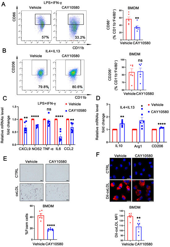Activation of EP4 suppressed macrophage M1 polarization and foam cell formation. (A,B) Flow cytometry analysis of CD86 and CD206 expression in BMDMs treated with Vehicle (0.00068% ethanol) or CAY10580 (100 nM) (n = 6). (C,D) qRT-PCR was used to determine the mRNA levels of pro-inflammatory cytokines and macrophage polarization markers in BMDMs pretreated with Vehicle (0.00068% ethanol) or CAY10580 (100 nM), followed by stimulation with LPS/IFN-γ or IL4/IL13 (n = 6). (E) Oil Red O staining and quantification of lipid accumulation in WT BMDMs pre-treated with Vehicle (0.00068% ethanol) or CAY10580 (100 nM) followed by stimulation with or without oxLDL (50 μg/mL) for 24 h (n = 6), scale bar: 50 μm; (F) representative images and quantitation of Dil-labeled oxLDL uptake in BMDMs pretreated with Vehicle (0.00068% ethanol) or CAY10580 (n = 6), scale bar: 20 μm; data presented as mean ± SEM, ns: not significant, * p < 0.05, ** p < 0.01, **** p < 0.0001, Unpaired t-test, BMDM: bone marrow-derived macrophage.