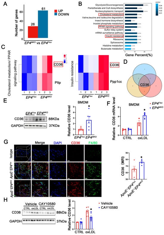 EP4 upregulated the expression of CD36. (A) The histogram depicts the number of DEGs between BMDMs from EP4Flox and EP4MKO mice after treatment with oxLDL. (B) The KEGG pathway enrichment analysis of DEGs. (C) The gene sets enriched in KEGG pathways related to inflammation and lipid metabolism. (D) Schematic diagram illustrating the overlap of DEGs across KEGG inflammation and lipid metabolism-related signaling pathways. (E) Western blot analysis and quantification of CD36 expression in BMDMs from EP4Flox and EP4MKO mice after treatment with oxLDL (50 μg/mL) for 24 h (n = 6). (F) qRT-PCR analysis of CD36 mRNA expression in oxLDL-stimulated BMDMs from the EP4Flox and EP4MKO mice (n = 3). (G) Double-immunofluorescence staining for F4/80 and CD36 in the aortic roots from ApoE−/−EP4Flox or ApoE−/−EP4MKO mice after 16 weeks of Western diet (n = 5). Nuclei were stained with DAPI (blue); F4/80 stained as green; CD36 as red, scale bar: 20 μm. (H) Western blot analysis and quantification of CD36 expression in BMDMs from WT mice pre-treated with or without CAY10580 (100 nM), followed by stimulation with or without oxLDL (50 μg/mL) for 24 h (n = 6). Data presented as mean ± SEM, ns: not significant, * p < 0.05, Unpaired t-test in (E,G), two-way ANOVA in (G,H). DEGs: differentially expressed genes; BMDM: bone marrow-derived macrophage; oxLDL: oxidized low-density lipoprotein.