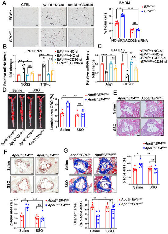 To assess the functional relevance of CD36 in EP4MKO-induced atherosclerosis, ApoE−/−EP4Flox and ApoE−/−EP4MKO mice were fed a Western diet for 12 weeks in vivo, followed by their being intraperitoneally injected with Sulfosuccinimidyl oleate sodium (SSO, CD36 inhibitor) or saline for an additional 4 weeks. Compared to saline-treated controls, SSO administration significantly reduced plaque area in both the whole aorta (Figure 7D) and the aortic root (Figure 7E), decreased intraplaque lipid deposition (Figure 7F), and increased collagen content (Figure 7G). Collectively, these findings demonstrate that EP4 regulates macrophage polarization and foam cell formation through CD36 regulation, thereby contributing to the progression of atherosclerosis.