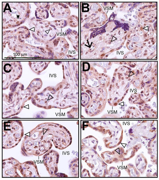 Expression of SRC-2 in human term-placental tissue: (A–E) Immunohistochemical staining shows the location of SRC-2 protein expression in chorionic villi of human term (39 weeks)-placental tissue from five subjects. The intervillous space (IVS) and the vasculosyntial membrane (VSM) demarcating maternal blood sinusoids are indicated. White triangle indicates a nucleus of the syncytiotrophoblast cell layer that is positive for SRC-2 expression. White asterisk highlights a syncytial knot, which is a prominent feature in the term placenta [47]. Expression of SRC-2 is also evident in sparsely distributed cytotrophoblasts ((A) (black triangle)), in perivascular fibroblasts of fetal blood vessels ((B) black arrow), stromal cells of the chorionic villus (open arrowhead), and in syncytiotrophoblasts (white triangle). (F) Immunohistochemical staining reveals a similar expression pattern for SRC-3. Scale bar in (A) applies to all panels.